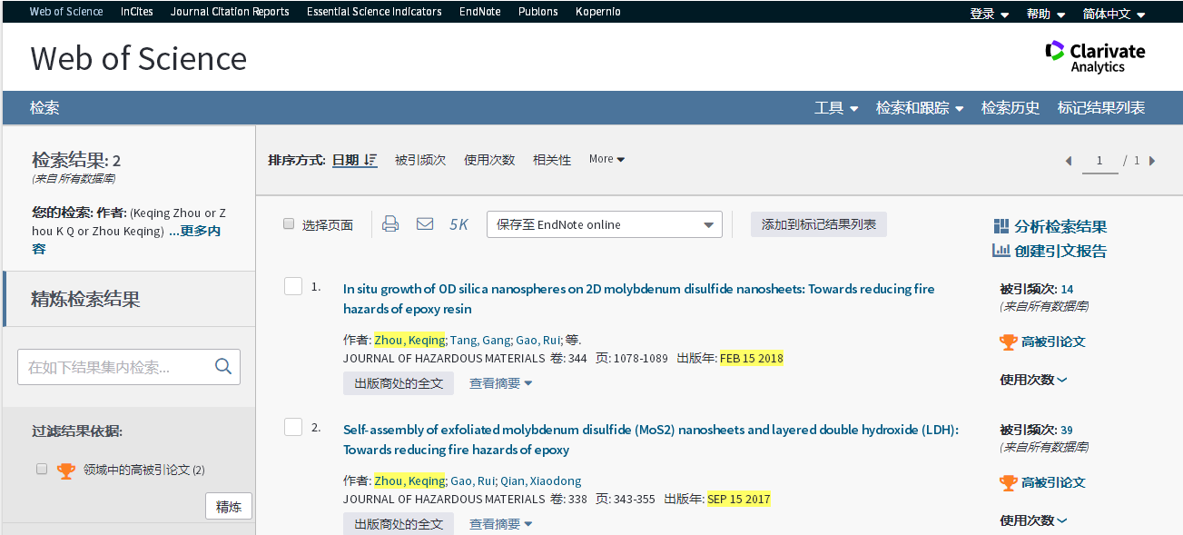 基本科学指标数据库(Essential Science Indicators,简称ESI)最新数据显示,安全工程系周克清老师发表的论文“In situ growth of 0D silica nanospheres on 2D molybdenum disulfide nanosheets: Towards reducing fire hazards of epoxy resin”入选高被引论文。该论文是周克清老师以中国地质大学(武汉)米兰官网入口_米兰(中国)为第一单位、第一作者和通讯作者身份发表的第2篇ESI高被引论文。2018年7月周克清老师发表的论文“Self-assembly of exfoliated molybdenum disulfide (MoS2) nanosheets and layered double hydroxide (LDH): Towards reducing fire hazards of epoxy”曾同时入选ESI高被引论文和热点论文。
