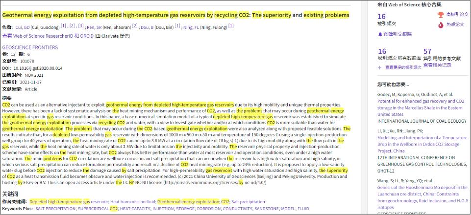 (通讯员:黄静)根据2022年3月基本科学指标数据库(Essential Science Indicators,简称ESI)最新数据显示,我院崔国栋副教授于2021年在国际地学期刊Geoscience Frontiers上发表的学术论文“Geothermal energy exploitation from depleted high-temperature gas reservoirs by recycling CO₂: The superiority and existing problems”入选ESI热点和高被引论文(Hot and Highly Cited Paper)。该论文第一作者兼通讯作者为崔国栋副教授,中国地质大学(武汉)米兰官网入口_米兰(中国)为第一署名单位。