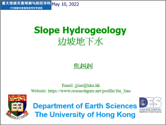 (通讯员 周佳庆)2022年5月10日上午,应我院唐辉明教授和周佳庆特任教授邀请,香港大学焦赳赳教授应邀作客2022年度第4期“重大地质灾害预测与防控学科”111创新引智基地学术讲座。讲座采用线上线下相结合的方式,讲座由李长冬教授主持,唐辉明教授、胡新丽教授、吴益平教授、张峰特任教授、周佳庆特任教授、叶阳特任教授等以及香港大学、香港科技大学、武汉大学、南方科技大学、长安大学、重庆大学、成都理工大学等多个单位180余名师生参加了本次讲座活动。
