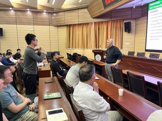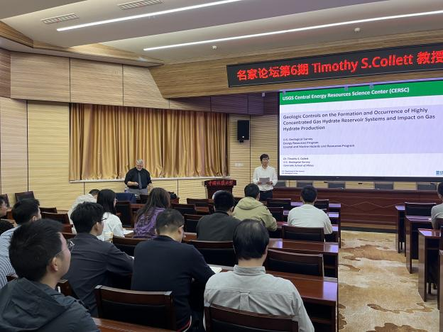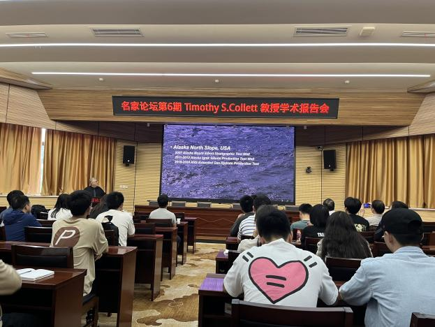 Timothy Collett教授对我校的诚挚邀请表示衷心感谢,并作了题为“Geologic controls on the formation and occurrence of highly concentrated gas hydrate reservoir systems and impact on gas hydrate production”的精彩报告。报告详细介绍了天然气水合物基础知识,对天然气水合物油气系统勘探情况进行了详细分析,以实例的形式系统总结了美国墨西哥湾、中国南海、日本南海海槽、韩国郁陵盆地和印度KG盆地的水合物勘探和开采情况,并对美国阿拉斯加冻土区前期和当前正在开展的水合物调查及试采情况进行了分享。最后,结合其丰富的现场调查研究经验,对未来水合物产业化开发面临的关键技术难题和研究方向进行了展望,并积极鼓励与会人员就报告内容开展交流和讨论。