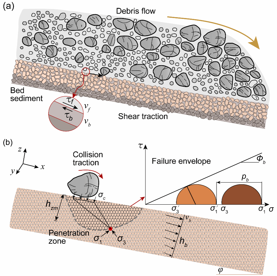 高位泥石流以完全剪切和激荡的形式沿程冲下,是山区最频繁且致命的地质灾害之一。泥石流在运移过程中能够裹挟物源,显著增加其方量和致灾能力。然而,泥石流的侵蚀界面理论尚未建立,极大制约了泥石流冲出方量预测和风险区规划。