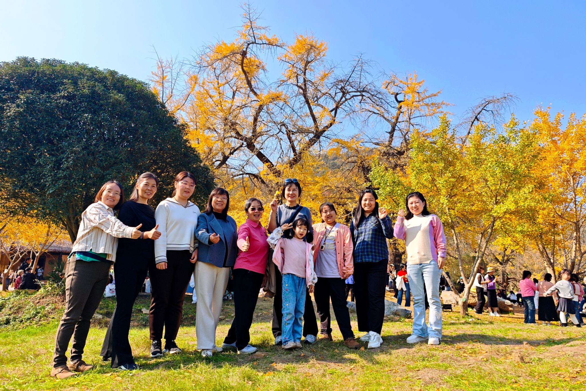 大家在银杏林间漫步,欣赏着千年古树的壮美风姿。高大的古银杏树矗立在草地上,叶片如金箔般在阳光下熠熠生辉。秋风拂过,无数金黄色的叶片蹁跹而下,宛如一场寂静的银杏雨,引来众人连连赞叹。凭借树牌上的二维码,老师们寻觅着最年长的银杏树。当“树龄2360年”的字样出现时,大家纷纷上前,张开双臂环抱粗壮的树干,向这份跨越两千年的生命韧性致敬。